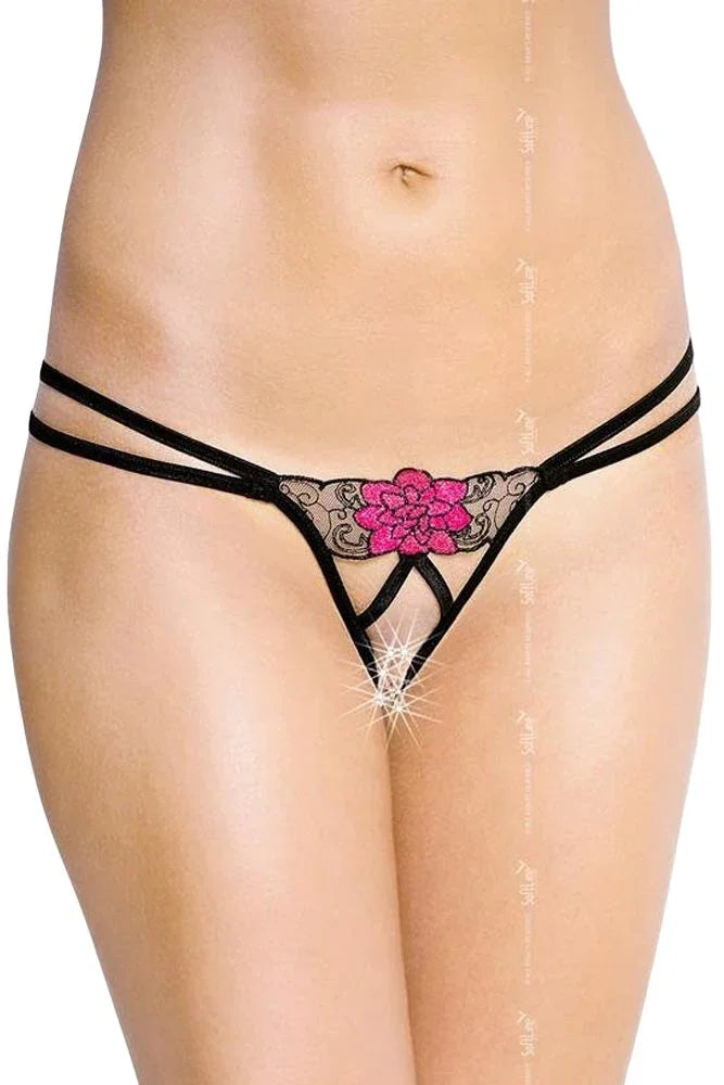 Πρόκειται για ένα μαύρο string το οποίο αποτελείται από διάφανη δαντέλα και στολίζεται με ένα ροζ τριαντάφυλλο.
