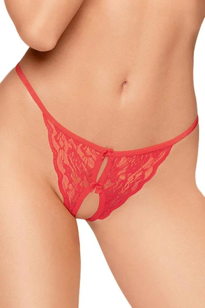Το στρινγκ είναι κατασκευασμένο από λεπτή κόκκινη μαλακή δαντέλα και κόκκινο λάστιχο να συνεχίζει στο πίσω μέρος, ενώ ο καβάλος του είναι ανοιχτός.