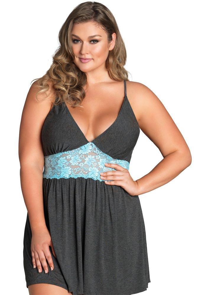 Γκρι νυχτικό με γαλάζια διάφανη δαντέλα και λεπτή ρυθμιζόμενη τιράντα.