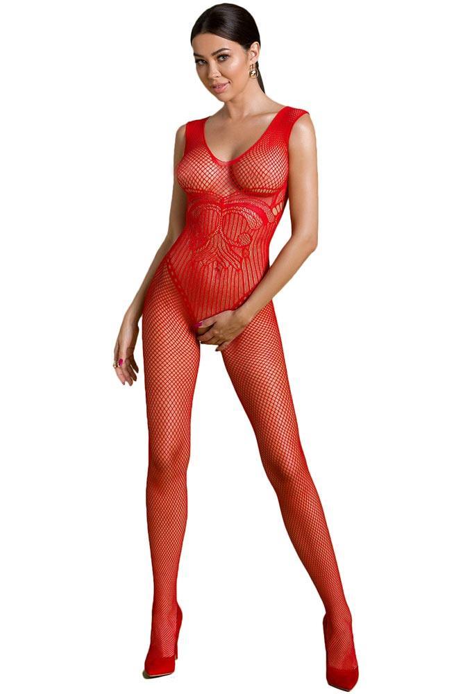 Οικολογικό κόκκινο ολόσωμο καλσόν με φαρδιά τιράντα και πρωτότυπο σχέδιο με άνοιγμα τόσο στο μπροστινό του μέρος, όσο και στο πίσω.