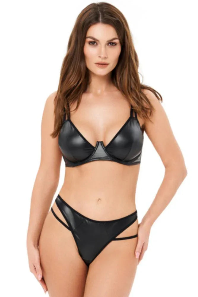 Ζήστε τον αισθησιασμό και την κομψότητα με αυτό το σετ που τονίζει τη θηλυκότητά σας και τονώνει την αυτοπεποίθησή σας. Αυτό το σαγηνευτικό σύνολο, κατασκευασμένο από ύφασμα που μοιάζει με λατέξ σε μαύρο χρώμα (υφή και look δερματίνης), είναι ιδανικό για γυναίκες που θέλουν να τονίσουν το μοναδικό στυλ και την αυτοπεποίθησή τους. Για βέλτιστη στήριξη, το σουτιέν διαθέτει μπανέλα που ενισχύει το φυσικό σχήμα του μπούστου ενώ παρέχει άνετη εφαρμογή. Η προσαρμογή του είναι τέλεια στο σώμα, με το σουτιέν να δένει στο πίσω μέρος με ρυθμιζόμενο κούμπωμα τριών θέσεων. Οι ρυθμιζόμενες τιράντες αναδεικνύουν υπέροχα το ντεκολτέ. Το κομψό στρινγκ ολοκληρώνει το σύνολο αναδεικνύοντας τους γλουτούς με δελεαστικό τρόπο. Αυτό το σετ συνδυάζει τη σαγηνευτική σχεδίαση με την υψηλή άνεση κατά τη χρήση, επιτρέποντάς σας να αισθάνεστε απόλυτα άνετα ενώ αναδεικνύετε την αισθησιακή σας πλευρά. Είναι η τέλεια επιλογή για γυναίκες που θέλουν να παρουσιάζονται με αυτοπεποίθηση και στυλ.