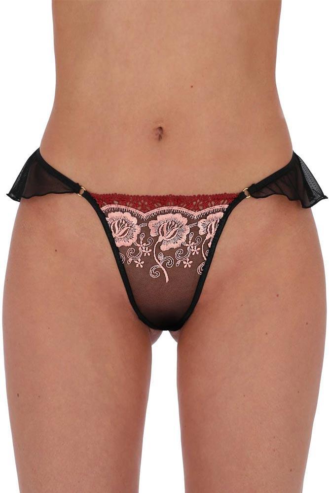 Μαύρο εσώρουχο με διαφάνεια και κόκκινη δαντέλα στο τελείωμα του, αλλά και σχέδιο με ροζ λουλούδια σε αυτό το πανέμορφο στρινγκ.