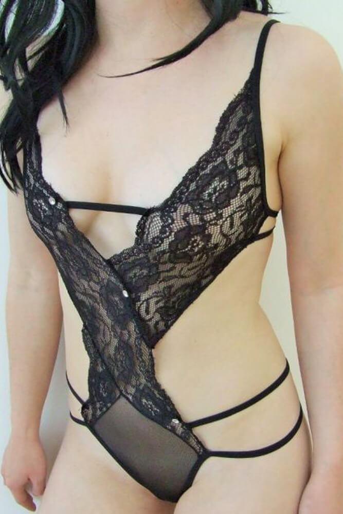 Κορμάκι που αποτελείται από μαύρη δαντέλα με λουλουδάτη σχεδίαση χωρίς να καλύπτει όλα τα μέρη του σώματός σας.