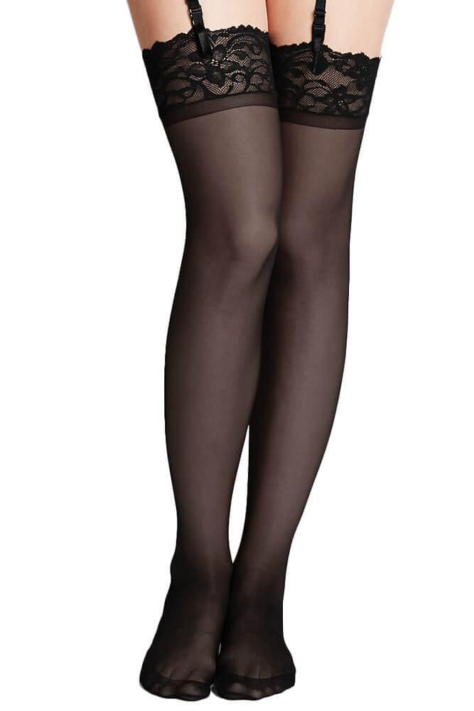 Μαύρες κάλτσες με δαντέλα στο τελείωμα και σιλικόνη, κατάλληλες για καλτσοδέτες.