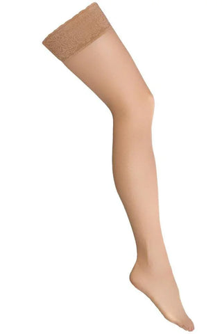 Μπεζ κάλτσες με δαντέλα στο τελείωμα, οι οποίες μπορούν να φορεθούν είτε μόνες τους είτε με ζαρτιέρες.