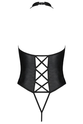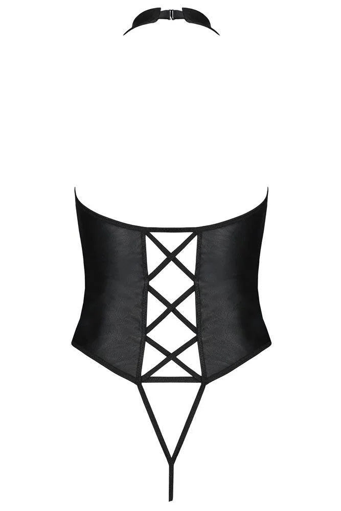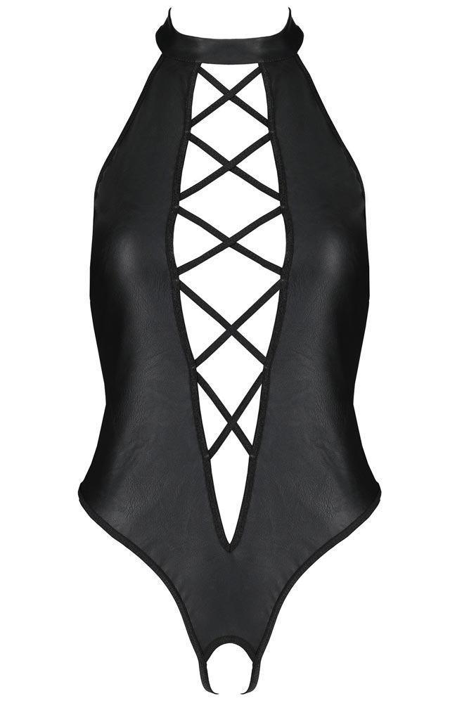 Κορμάκι από δερματίνη με χιαστί στο μπούστο και ανοιχτό στον καβάλο.