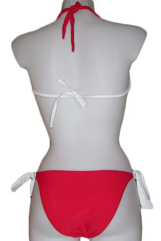Κόκκινο μπικίνι με λευκές λεπτομέρειες το οποίο στολίζεται με αφαιρούμενο κόσμημα στο στήθος.