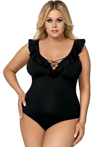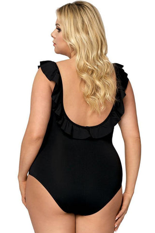 Ένα μαύρο ολόσωμο μαγιό με βολάν στους ώμους και στο πίσω μέρος της πλάτης σε μεγάλο μέγεθος με τέλεια εφαρμογή το οποίο αναδεικνύει και κολακεύει το σώμα σου.