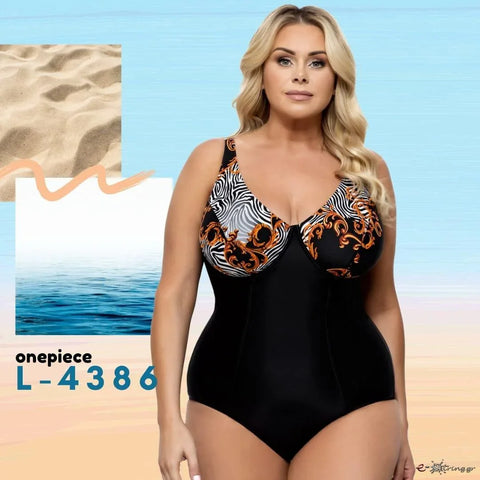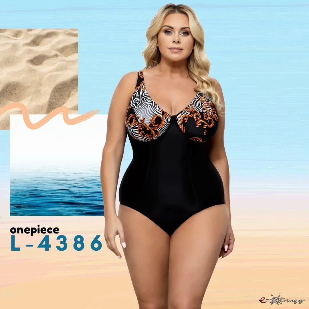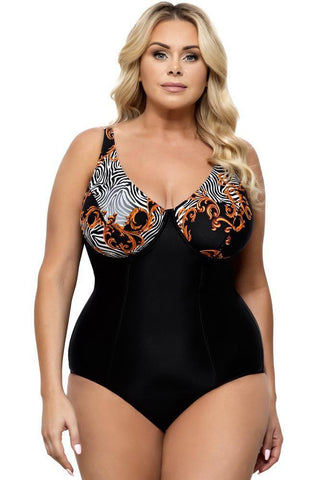 Ένα μαύρο ολόσωμο μαγιό σε μεγάλο μέγεθος με καφέ και λευκό μοτίβο στο στήθος με τέλεια εφαρμογή το οποίο αναδεικνύει και κολακεύει το σώμα σου.