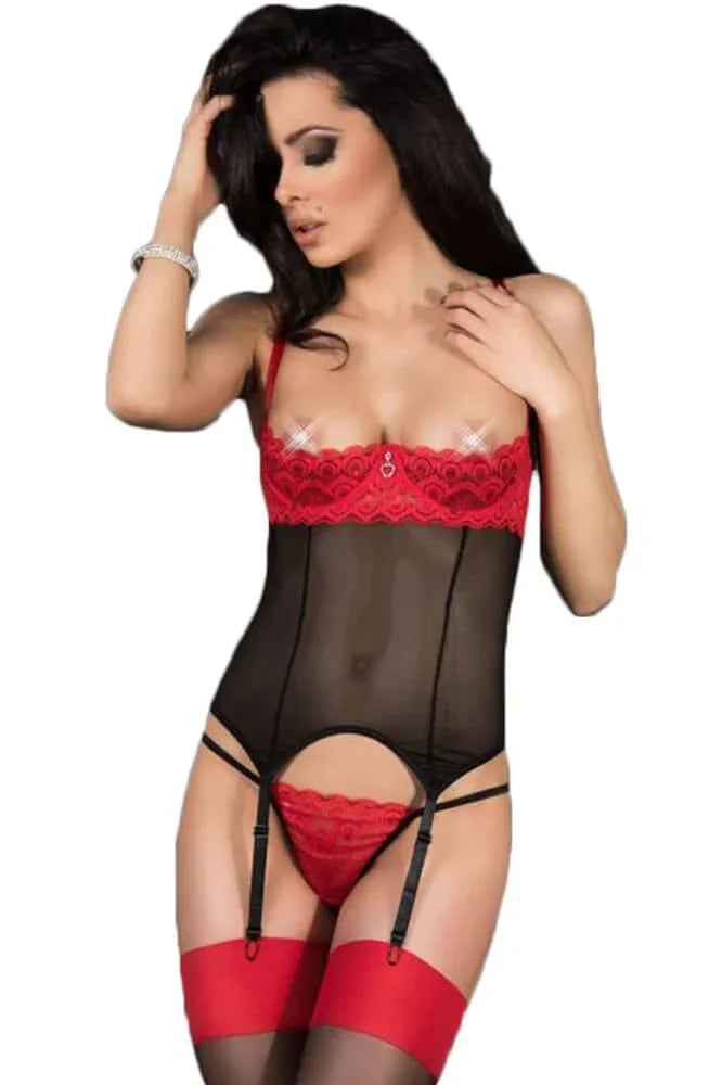 Κομψός μαύρος διάφανος κορσές συνδυασμένος με κόκκινη δαντέλα στο μπούστο, με ενσωματωμένες τιράντες ζαρτιέρας.