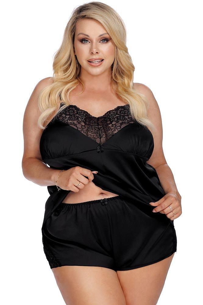 Απλό και κομψό σετ 2 τεμαχίων, που αποτελείται από γυαλιστερό πάνω μέρος με δαντέλα στο μπούστο και ρυθμιζόμενες τιράντες και ένα ασορτί μποξεράκι.