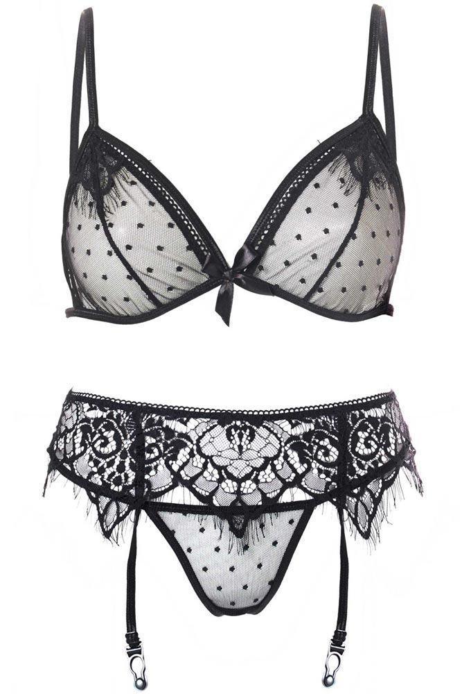 Γυναικείο σετ εσωρούχων που περιλαμβάνει το διάφανο bralette σουτιέν, το στρινγκ αλλά και την ζαρτιέρα.