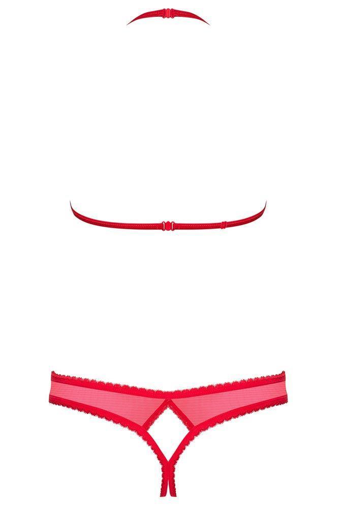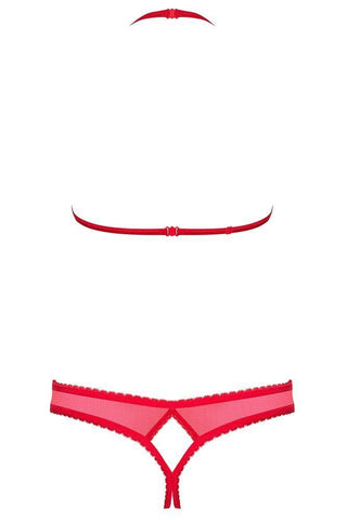 Αποτελείται από ένα σουτιέν που δένει με γαντζάκι στο πίσω μέρος καθώς και πίσω από τον λαιμό και ένα στρινγκ που είναι ανοιχτό στον καβάλο, ενώ και τα δύο είναι στολισμένα διακριτικά με κόκκινους φιόγκους που προσδίδουν μια έξτρα φινέτσα και στυλ στο σετ!