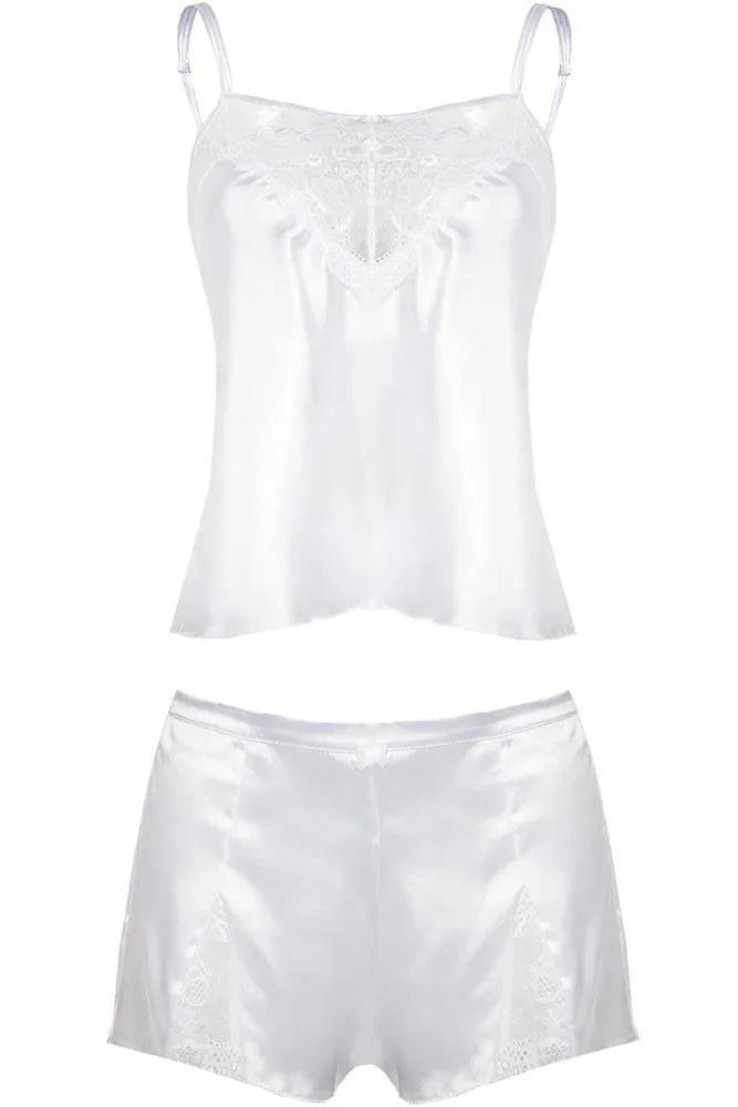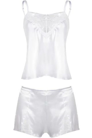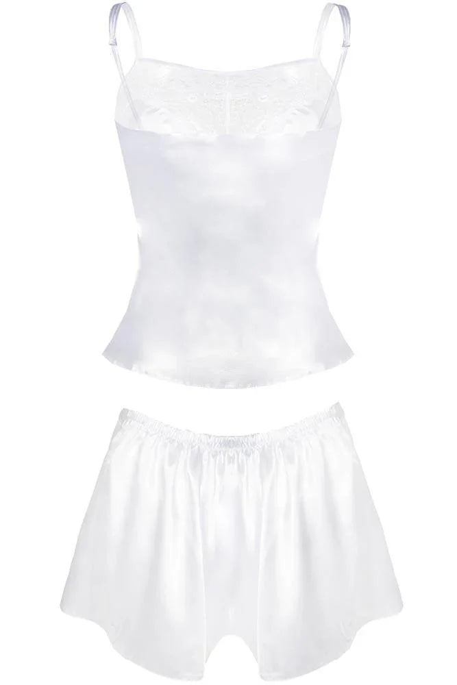 Γυναικείο σετ εσωρούχων σε λευκό χρώμα αποτελούμενο από το τοπάκι που διαθέτει ρυθμιζόμενες τιράντες, διαφανή δαντέλα στο στήθος και σατέν υφή στο υπόλοιπο μέρος του.