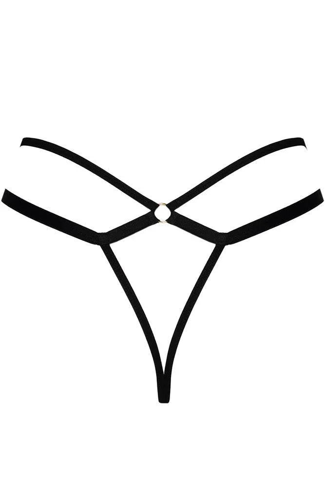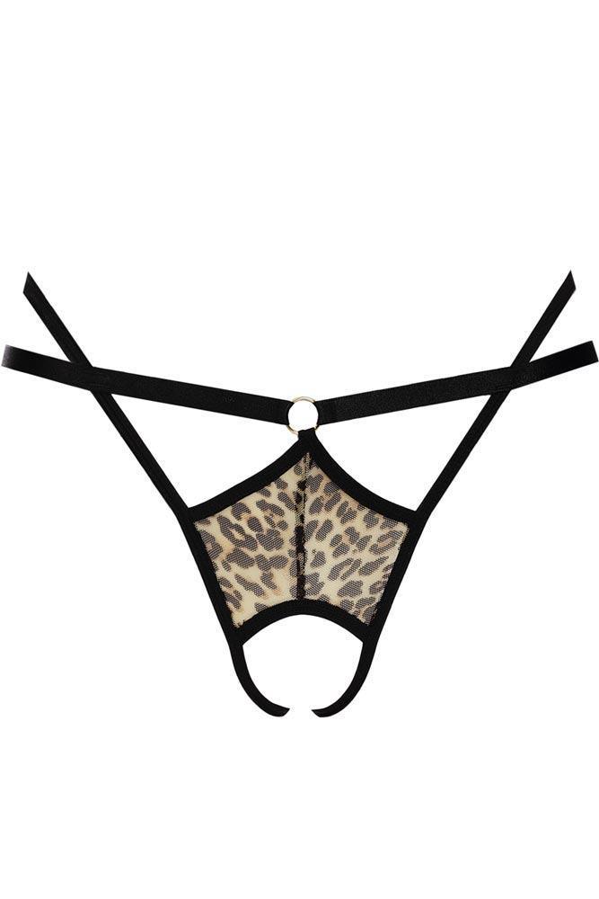Λεοπαρ μοτίβο και μαύρο λάστιχο, ανοιχτό στον καβάλο και δύο σειρές από λάστιχο που καταλήγουν σε τρίγωνο στο πίσω μέρος για μια τολμηρή εμφάνιση.